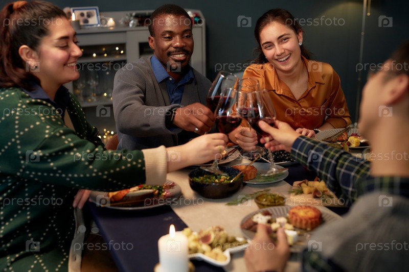 Группа друзей, щелкающие очками, празднуя праздник во время ужина в канун Рождества
