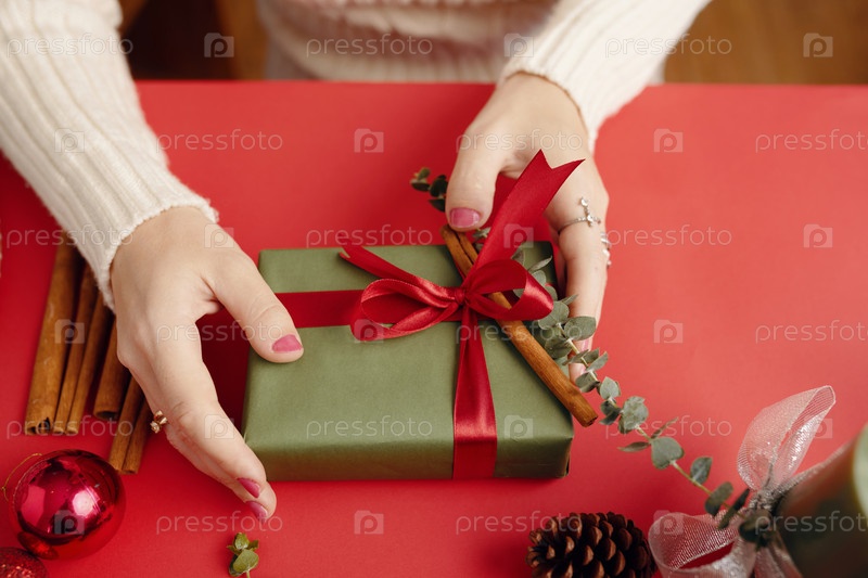 Упаковка праздничного подарка с красной лентой на столе