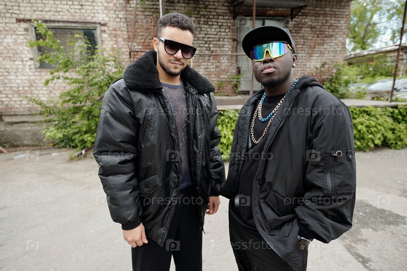 Портрет двух мужчин, позирующих в городской обстановке, носящих стильные куртки