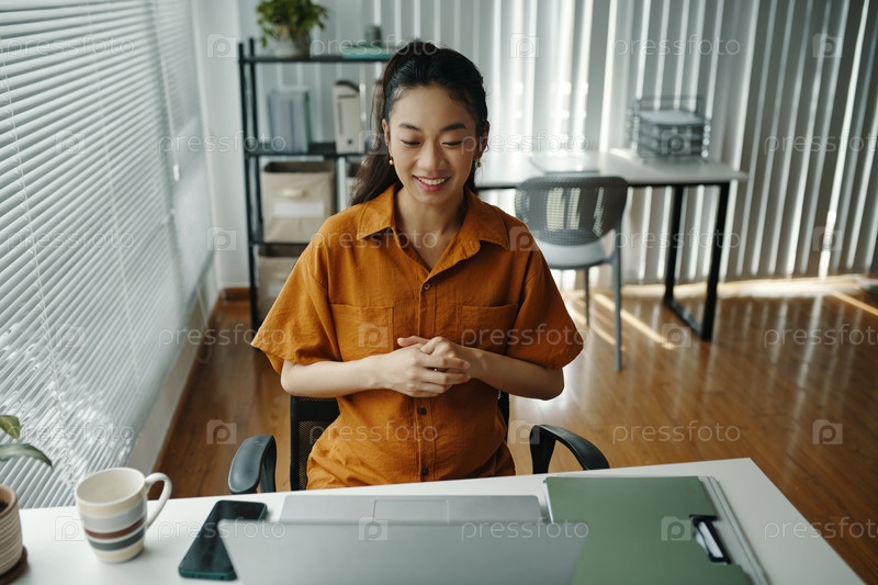 Улыбающаяся беременная женщина сидит за офисным столом с планшетом