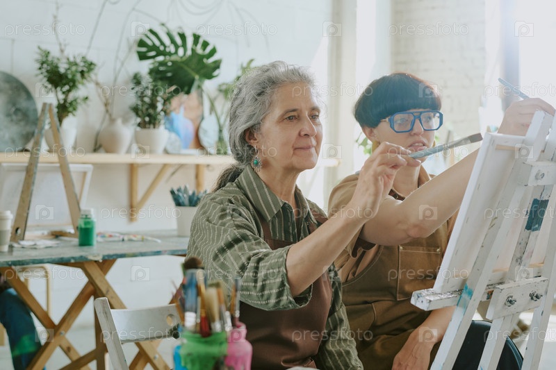 Женщина-пенсионерка рисует со своим учителем