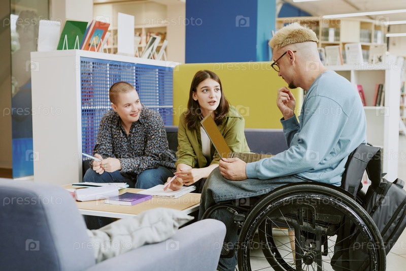 Группа студентов, сотрудничающих в современной библиотеке