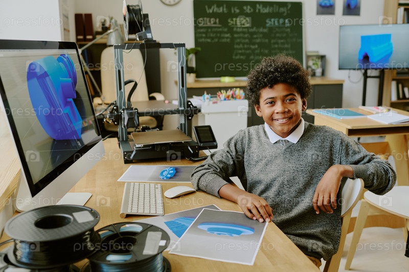 Улыбающийся мальчик сидит от 3D-печатного оборудования