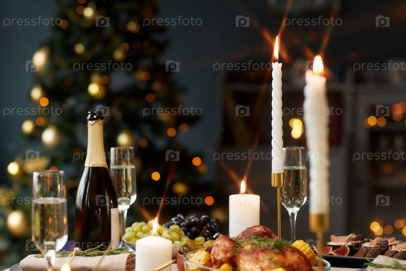 Обеденный стол с огнями, светящимися на свечах в Рождество