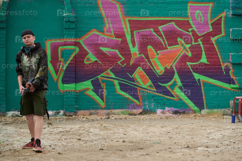 Художественные работы граффити на стене и художник мужского пола