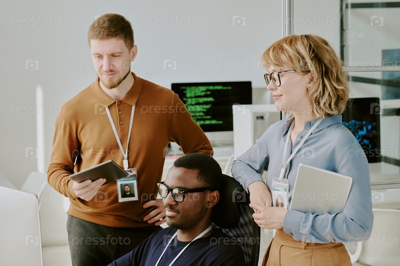 Молодые мужчины и женщины, работающие вместе в компании по кибербезопасности