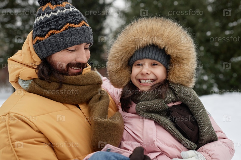 Счастливый отец и дочь наслаждаются прогулкой зимой