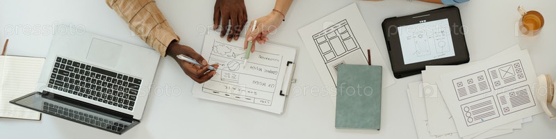 Коллаборативная команда обсуждает планы дизайна