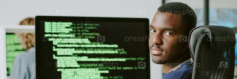 Молодой чернокожий работник кибербезопасности смотрит на камеру веб-сайт Header