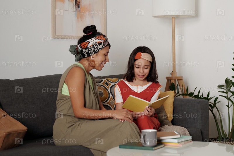 Мать и дочь читают вместе на диване