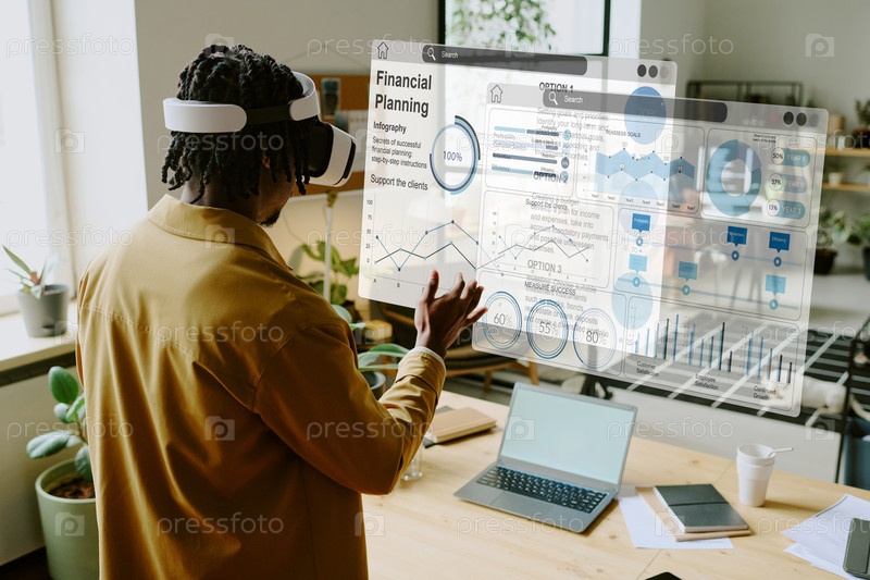 Черный человек тестирует приложение VR в современном офисе