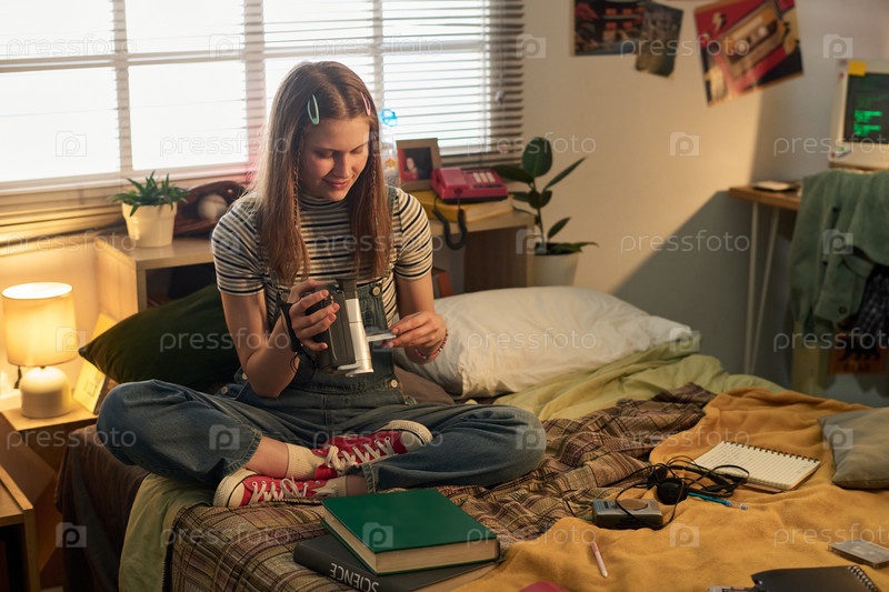 Девушка в спальне с гаджетами и учебными материалами