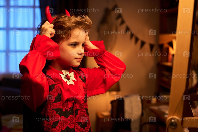 Мальчик надевает головной пояс с красными рогами