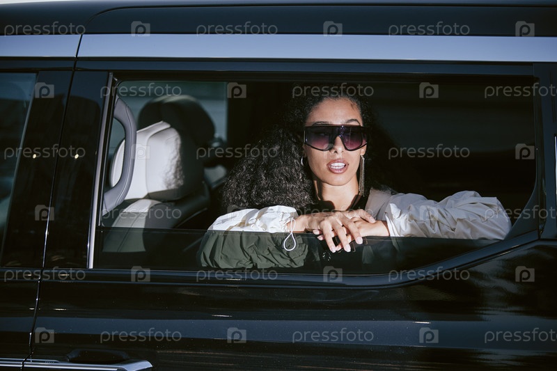 Знаменитая женщина в солнцезащитных очках сидит в машине, позируя под молниеносным светом для папарацци
