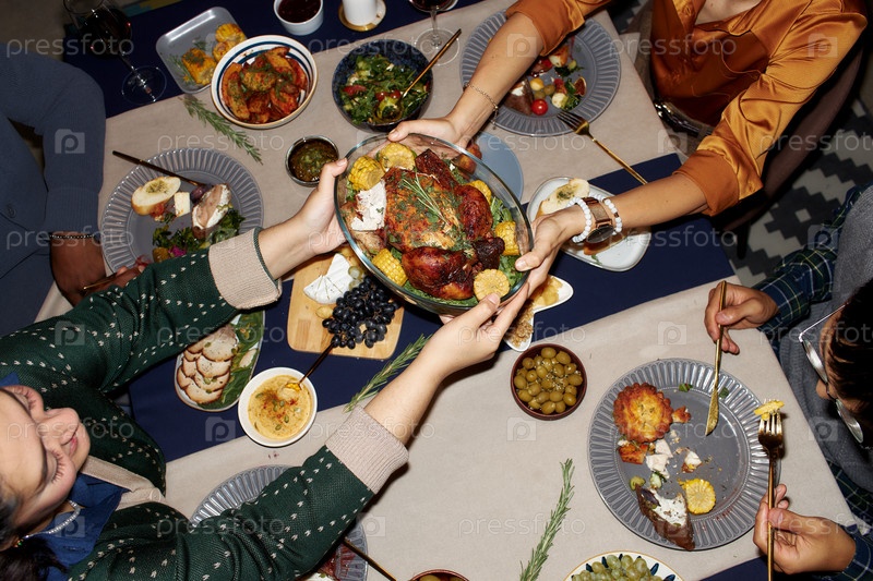 Женские руки передают приготовленную индейку за обеденным столом во время еды на рождественском ужине