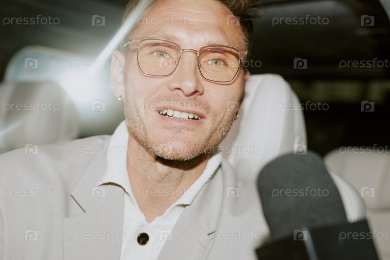 Портрет мужской знаменитости в очках, разговаривающей с журналистами, сидящими в машине
