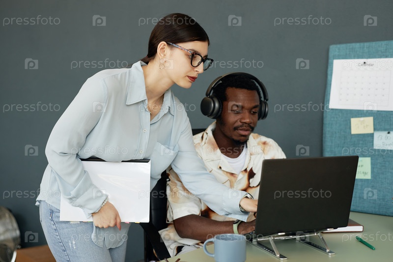 Два коллеги используют компьютер вместе, консультируя
