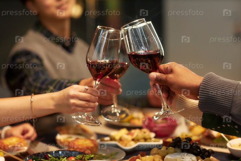 Люди, стучащие бокалы с вином, празднуют Рождество на домашнем обеде