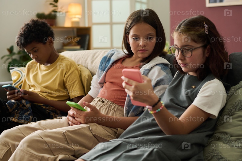 Дети, использующие смартфоны на уютном диване