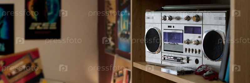 Выставка Vintage Boombox на деревянной полке
