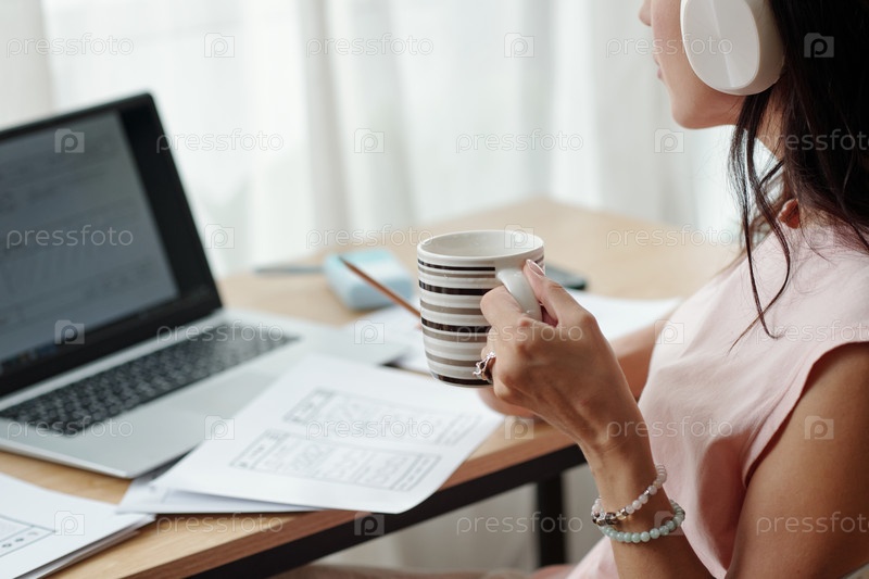 Женщина, работающая с ноутбуком и профессиональными наушниками