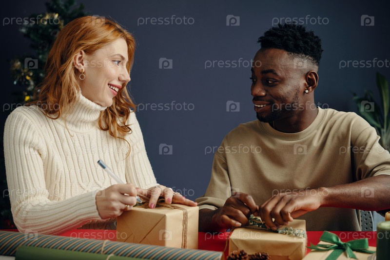 Улыбающаяся пара вместе упаковывает рождественские подарки
