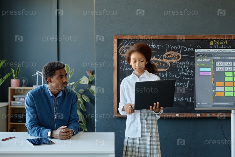 Черная девушка держит ноутбук, дает презентацию в классе с учителем смотрящим