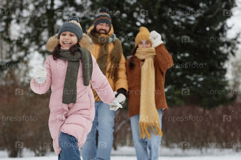 Милая девочка бегает по лесу с родителями