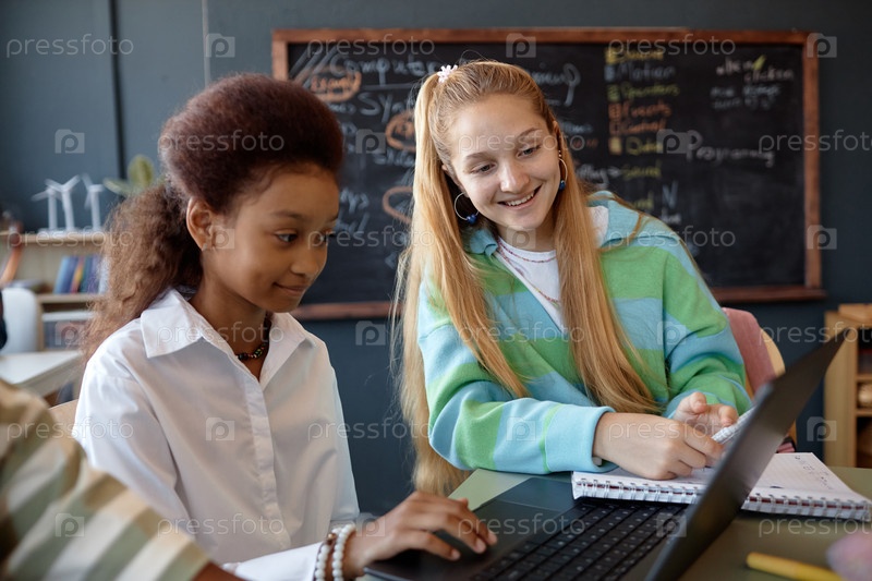 Две улыбающиеся девочки наслаждаются уроком в классе с помощью компьютера