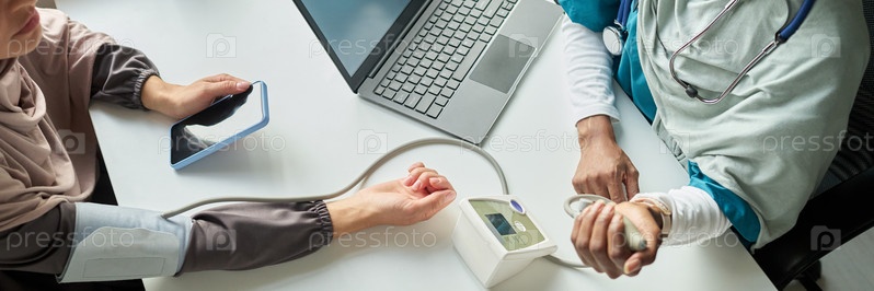 Мусульманский медицинский профессионал проверяет кровяное давление пациента
