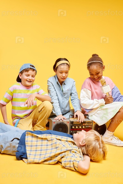 Трое улыбающихся детей играют музыку на Boombox смотрят на мальчика, лежащего на полу в желтой студии
