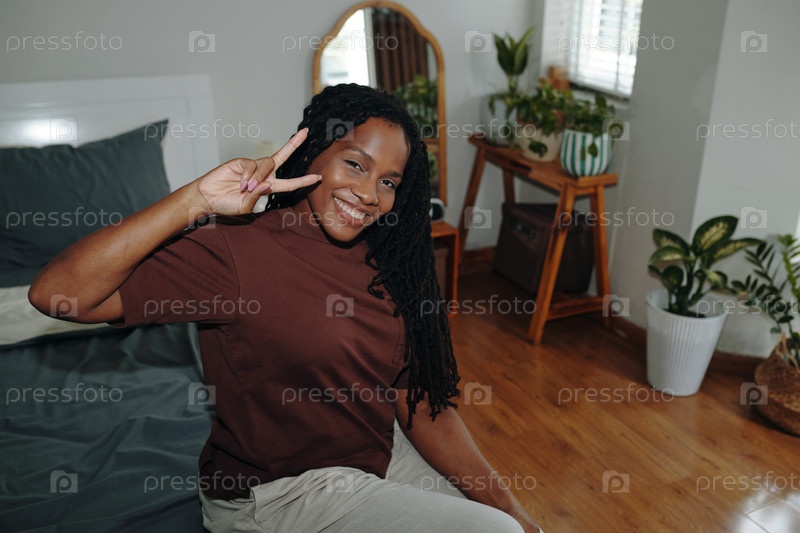 Улыбающаяся женщина отдыхает в уютной спальне с растениями