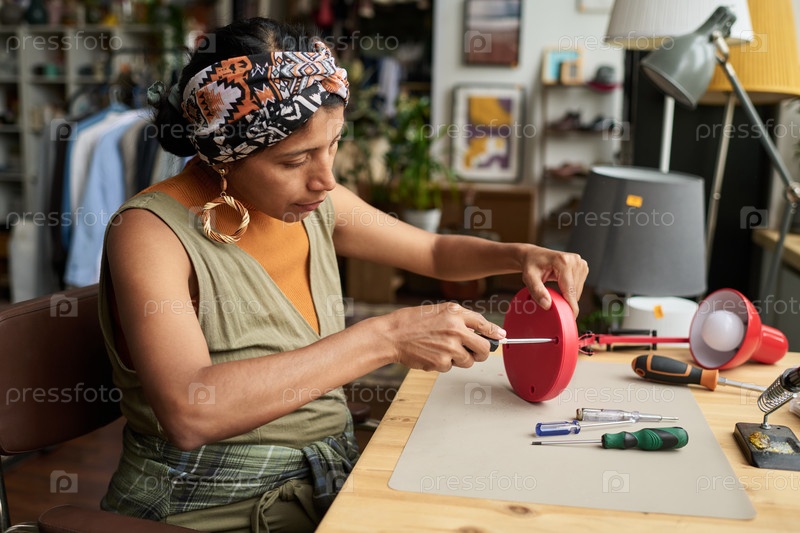 Женщина фиксирует винты в электрической лампе