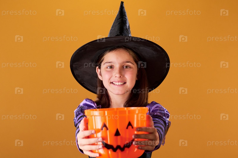 Счастливая ведьма Хэллоуина просит сладостей