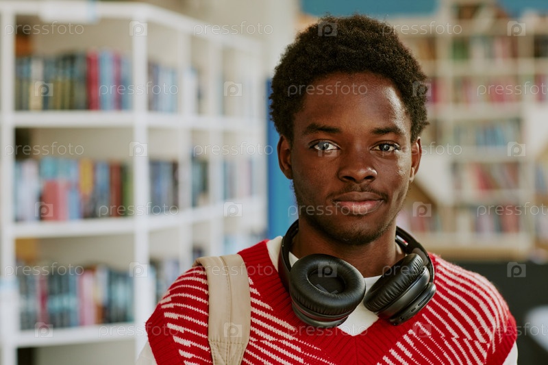 Портрет молодого человека, носящего наушники в библиотеке