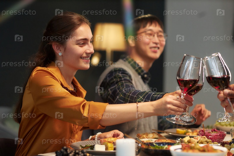 Улыбающаяся женщина поднимает тост Празднование Рождества во время друзей Собрание на домашнем обеде