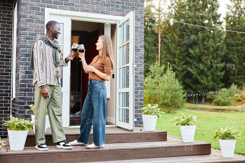 Мультирасовая пара, сжимающая винные бокалы