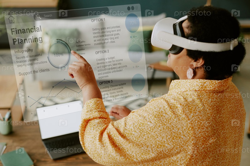 Женщина, изучающая финансовый план на VR-презентации