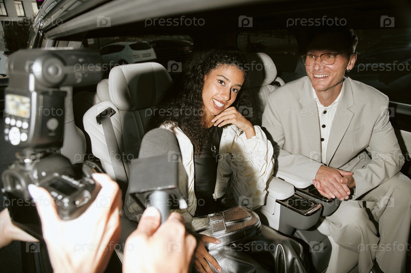 Улыбающаяся знаменитость, опрошенная репортерами телевизионных СМИ во время сидения в машине с мужчиной