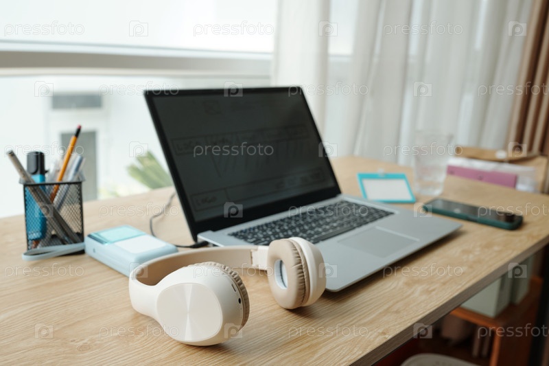 Современное рабочее пространство с ноутбуком и наушниками