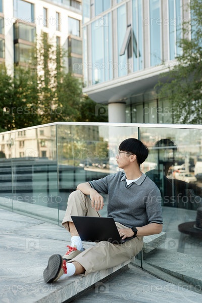 Азиатский мужчина смотрит в другую сторону Работает на ноутбуке, сидя на земле на свежем воздухе