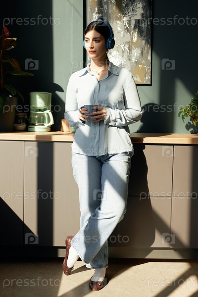 Уверенная в себе девушка, которая носит наушники и стоит у кофейни на солнце