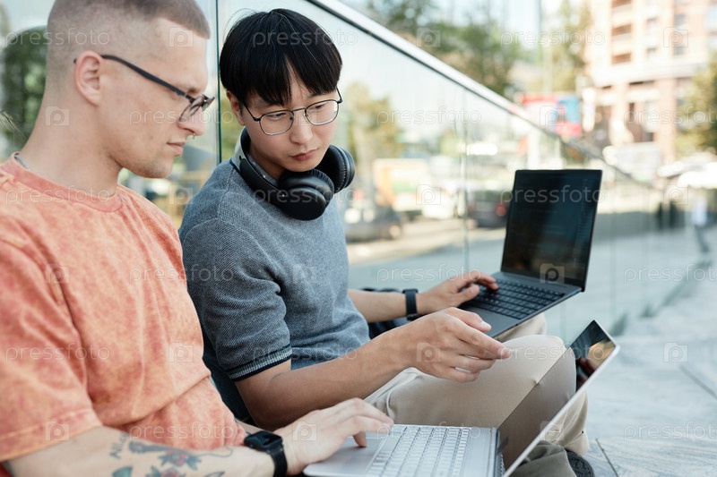 Азиатский мужчина указывает на экран ноутбука, работая вместе с коллегой на открытом воздухе