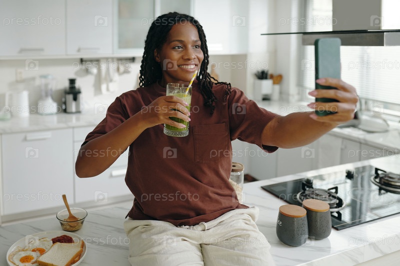 Молодая женщина делает селфи на современной кухне