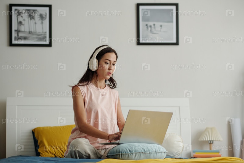 Азиатская женщина отдыхает в постели, используя домашний ноутбук