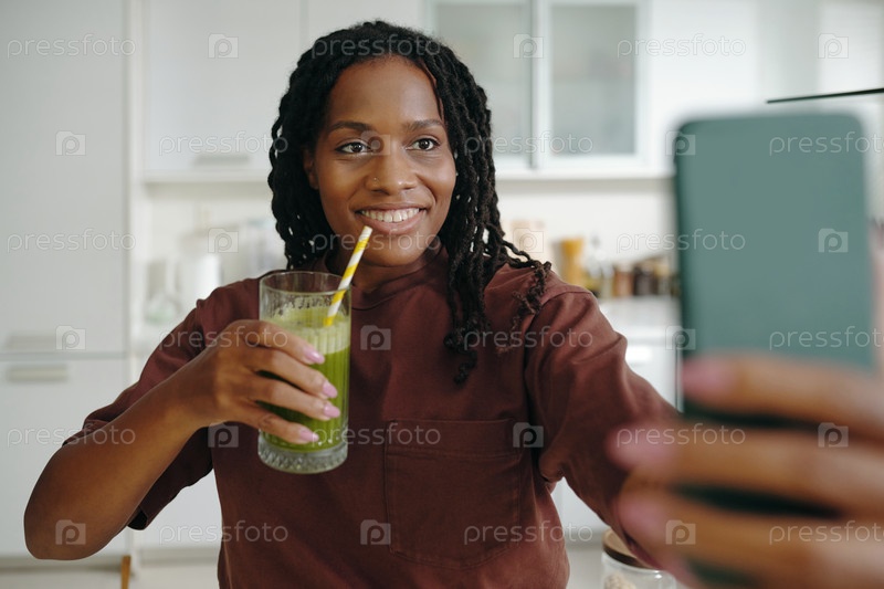 Улыбающаяся женщина пьет зеленый смузи на домашней кухне