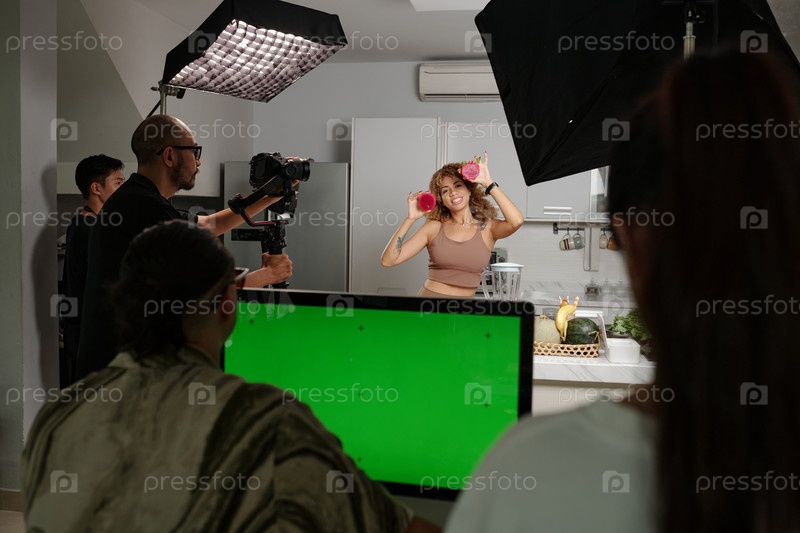Оператор снимает модель с фруктами в студии