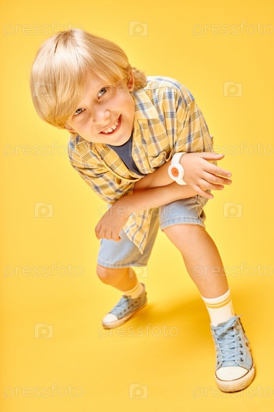 Улыбающийся мальчик в платовой рубашке улыбается камере склоненный колено на жёлтом фоне в студии