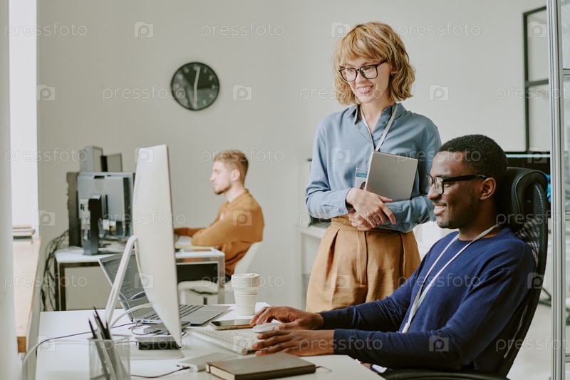 ИТ-специалисты улыбаются, глядя на компьютерный экран