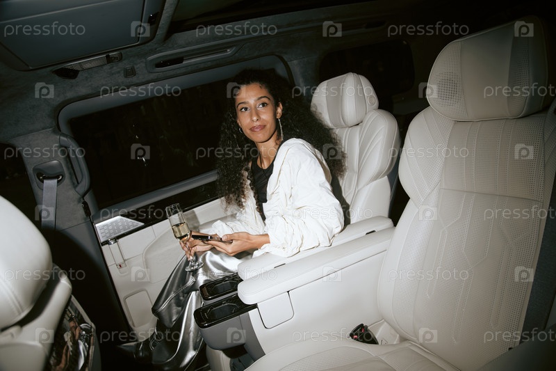 Женская знаменитость празднует фотографию с шампанским, сидя в машине